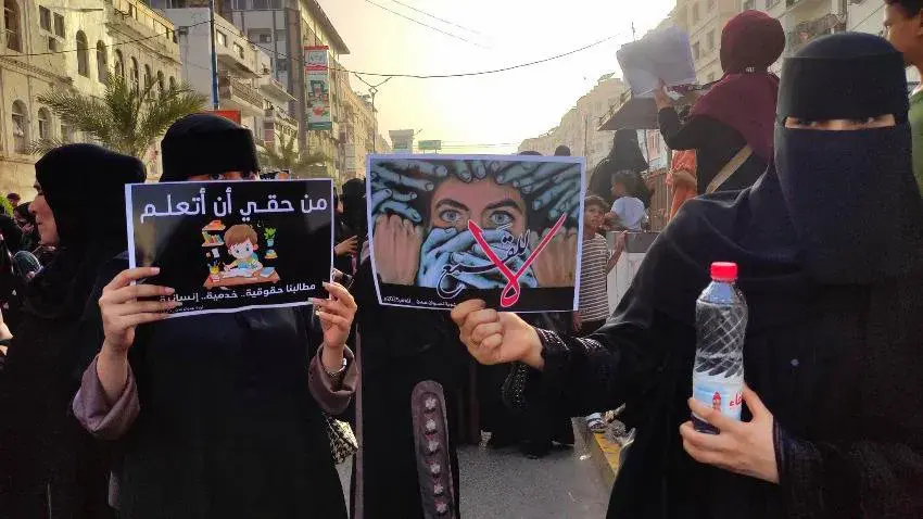 مصادر محلية قالت إن عشرات النساء تمكن من الوصول إلى الشارع الرئيسي بمدينة المعلا، ونظمن تظاهرة احتجاجا على استمرار التدهور الواسع في الخدمات وفي مقدمتها الكهرباء.