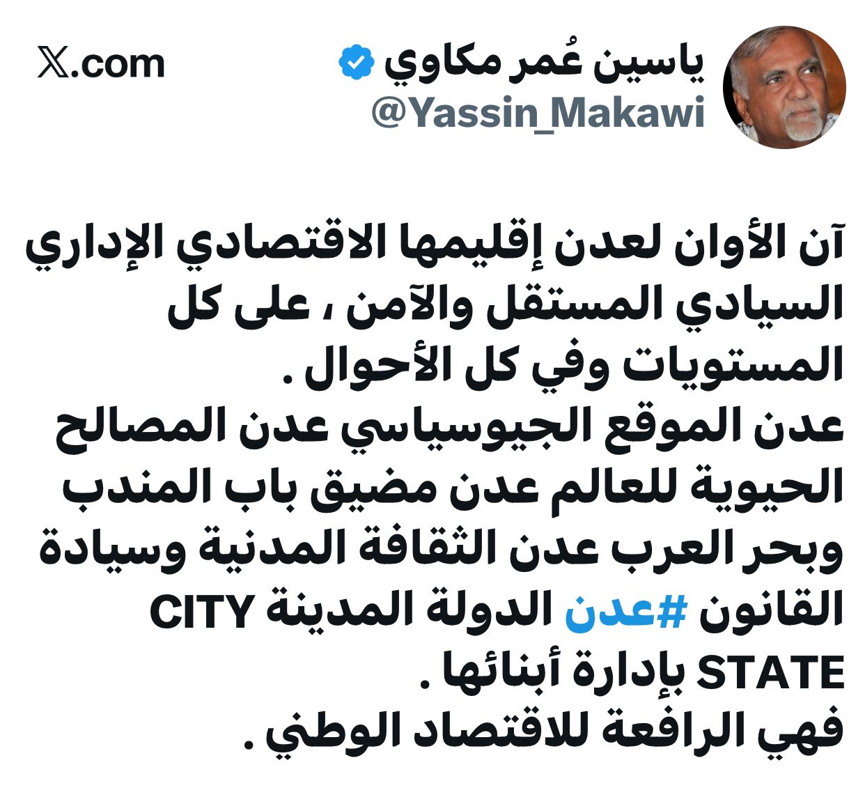 نشر الأستاذ ياسين مكاوي، مستشار رئيس الجمهورية ورئيس مكون الحراك الجنوبي المشارك على حسابه الرسمي في إكس تغريدة تناول فيها مستقبل مدينة عدن مؤكّداً على أهميتها الاستراتيجية والاقتصادية والسياسية